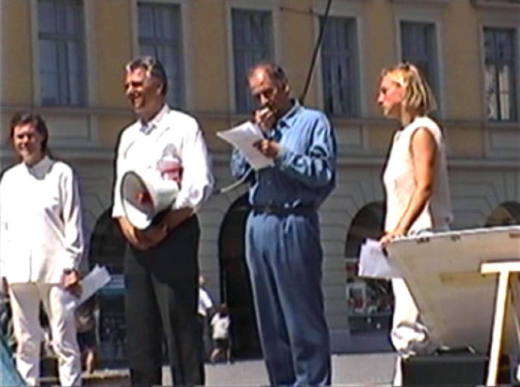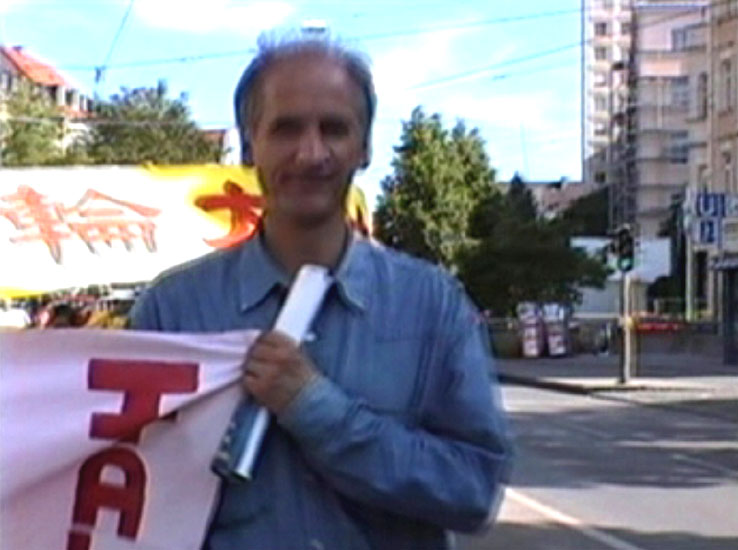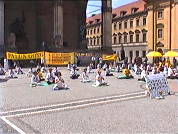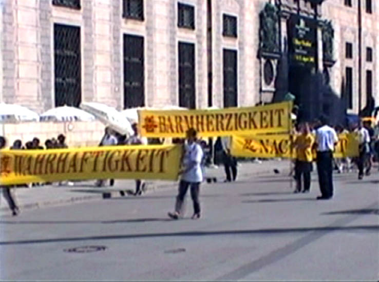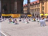 | 世界需要真善忍 | 慕尼黑法轮功学员在市中心大广场上 | 身材魁梧的德国警官已经修炼法轮功四年了,他热心地拿着话筒协助现场的反迫害演讲 |