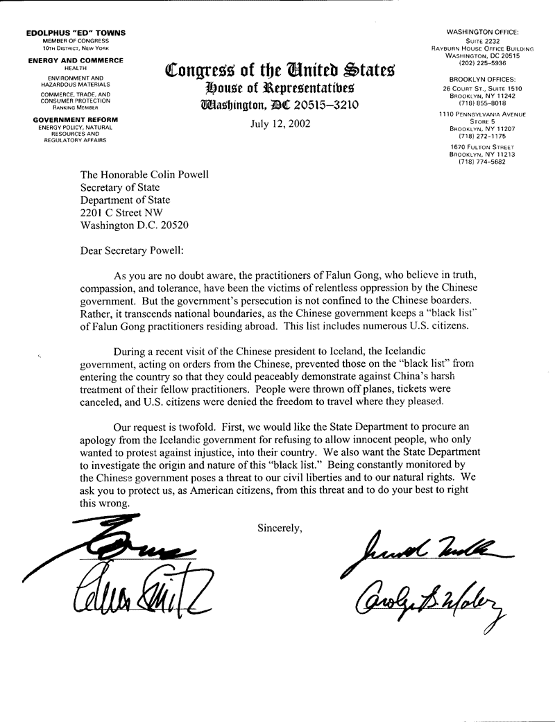 我们的请求包括两个方面。第一,我们希望国务院要求冰岛政府就拒绝无辜的、只想抗议不公的人入境道歉。我们也希望国务院调查“黑名单”的来源和性质。中国(江泽民)政府不断地对我们监视,威胁到了我们的公民自由和天赋的权利。我们要求阁下保护我们美国公民免受这种威胁,并尽阁下所能矫枉。