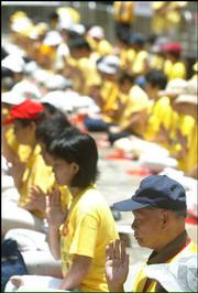 【明慧网2002年7月4日】2002年7月3日,来自十一个国家及地区的一百多名法轮功学员三日在香港中环遮打花园练功,抗议中共镇压法轮功。中央社记者卢健辉香港传真