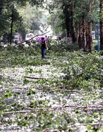 新华网7月4日消息,7月4日15时许,持续多日高温天气的冰城哈尔滨气候突变,电闪雷鸣中下起夹着冰雹的暴雨并刮起七、八级大风,许多树木的枝干被砸断、刮断。