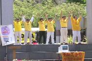 活动中学员们展示了正法之路图片展及法轮功在中国被残酷迫害的图片事实。此次重点展出的图片是被迫害的大陆学员所揭露于世的他们在监狱中所受的各种酷刑,包括老虎凳、竹签扎指等。