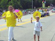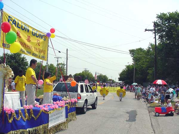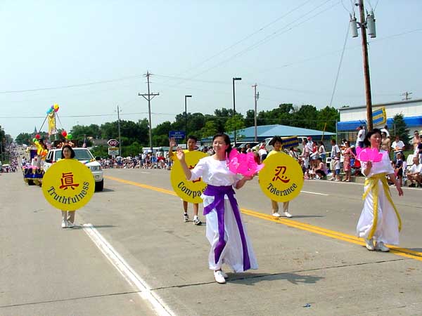 节日的气温高达92度,骄阳似火,但是前来观看游行的人们仍然很多,站满了近两英里的街道两旁。这是我们第二次参加他们的国庆节游行,加上圣路易法轮功学员经常抽时间和当地学员一起办大法介绍班,接受媒体采访,到大学教功等等,所以人们已经对我们有一定的了解。很多人远远地就向我们招手、鼓掌,还有人索要资料。我们准备的印有“法轮大法”的气球更是大受欢迎。其中有一群中学生,很远就注视着一位学员手中拿着的大圆板上用中英文写的“忍”字。其中有一男生指着中文的“忍”字说:“忍。太好了!只不过我不知道怎样用中文写这个字。”