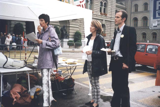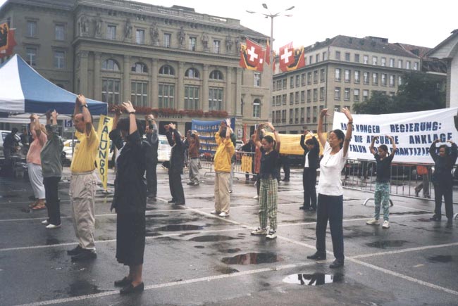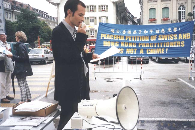 瑞士学员指出:如果此案判决有利于原告方面,这等于给侵犯人权发了通行证。来自日内瓦州的议员布朗莎女士代表她的议员同事在发布会上表示支持法轮功学员的正义行动,呼吁瑞士政府关注此案,并希望香港政府善待法轮功学员,确保公民的言论和集会自由的权利。在发布会上,还宣读了来自跨国激进党、国际人权协会等组织的声援信。发布会结束后,学员们在广场上一起炼功、发正念。