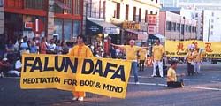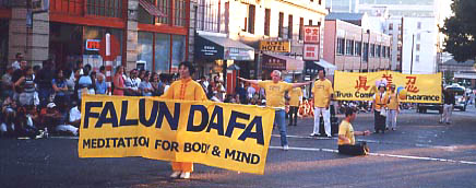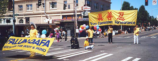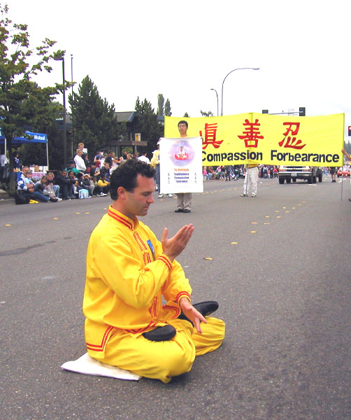 第8个游行-湖城“先锋日”游行,是美国西北地区最大的表演性游行之一。学员们齐心合作,金光闪闪的大法横幅,整齐的队形,悠扬的炼功音乐,第一和第五套功法的表演,加上三位身着传统中国服装的女大法弟子,向世人展示了大法和大法弟子的风貌。法轮功游行队伍荣获了成年方队表演组的第一名奖。