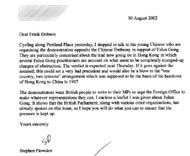 抗议者呼吁英国民众给议员写信督促外交部采取任何可能的行动。他们的传单显示英国议会和许多其它的组织已经对此表达了意见。我希望您能尽力而为以确保不断增加(对香港政府)的压力。