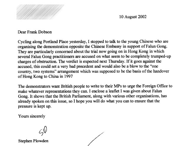 下面这封信是一位在中使馆前静坐请愿的大法弟子在一次发正念结束时在身边发现的,原来是一位素不相识的英国人留下的一封他写给议员的复印件。全信翻译如下: