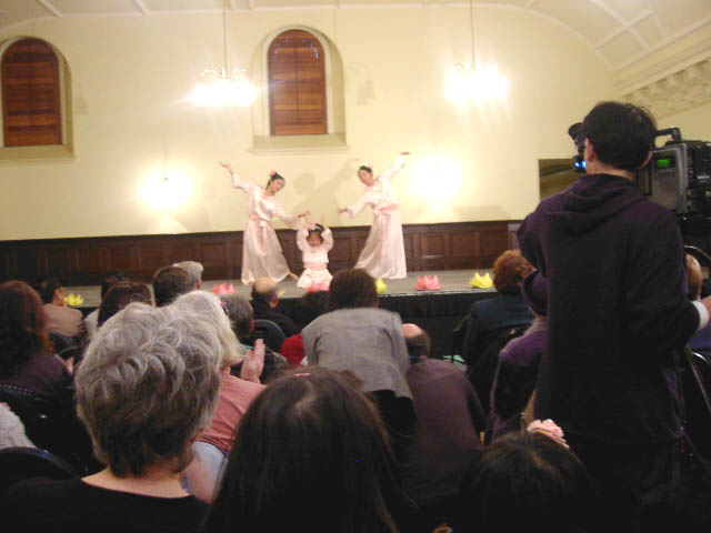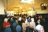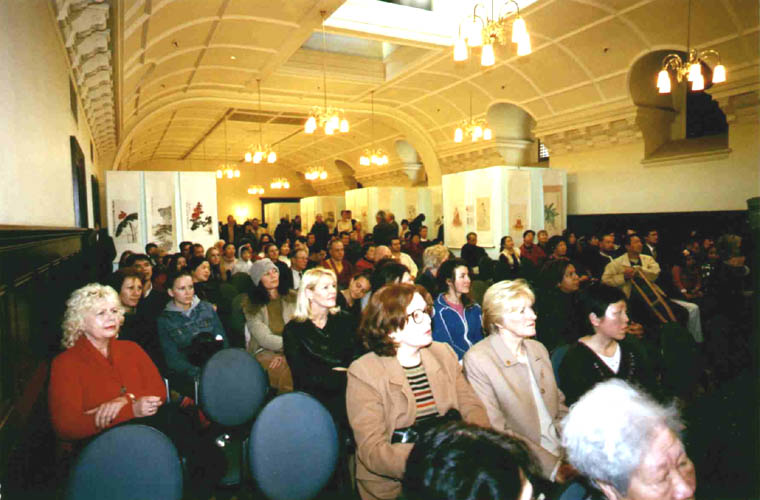 这次艺术展除了观展人数大大超出预计之外,大法学员与民众的融合程度也是前所未有的。前来看画的除了我们邀请到的市长、市议员、华人社团代表、侨界知名人士、媒体和前来义务表演的歌手外,更多的是我们不认识的人。当主持人在介绍章翠英时说到:“她拥有了一门世界性的语言,因为她有着大真、大善和面对磨难时的坚定信念和决心”时,全场观众爆发出了热烈的掌声;一位歌手临时改变了表演的曲目,并说,“我想你们忘了讲了,这次艺术展表达的一个主题便是信念。所以我将唱两首与信念有关的歌……”;特赦国际的代表除了一如既往地谴责了江泽民政府对法轮功的“系统的、由国家认可的”迫害外,也强调了在今日社会里播种“善的种子”的重要,她说特赦国际就是在当年一个人的一个善的愿望上而发展成为了今日有着百万成员的组织的;维省妇女信托基金会召集人则在发言中说,我的力量来自于以内心的和谐和善良,“要慈悲,而不要冲动。”