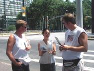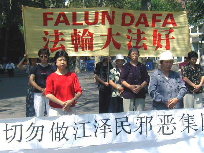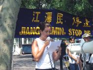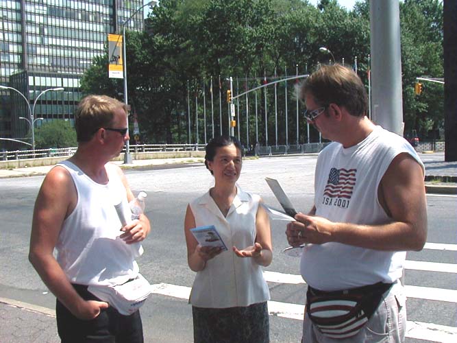 新闻发布会期间,学员们手持横幅发正念并演示了功法。学员们向过往的行人和执勤警察讲述柬埔寨事件和中国江泽民政府迫害法轮功的真相,并递上真相资料和光盘。