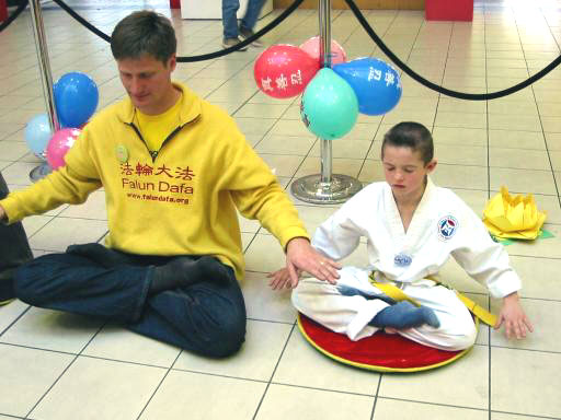 一位有一双儿女的中年妇女非常喜欢东方文化,觉得法轮大法非常好,主动提出要联系给儿子教中文的老师,让学校里的所有孩子都有机会学到五套功法。有位还穿着武术炼功服的小男孩,看到学员炼功,征得妈妈同意后,马上请一位西人学员教他打坐,还能双盘,学得非常认真。他妈妈也表示会带他去炼功点学功。