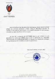 得知在中华人民共和国发生的对修炼法轮功的人施以的歧视、迫害,虐待及酷刑,我要表示我对受害者的支持,对这种与尊重人权背道而驰的行径予以谴责。我以卡逖埃尔市--我是此市的市长--及卡罗县的百姓的名义--我是阿尔匹斯滨海省议会在这个县的代表,要求中国这样一个大国的政治领导人停止这场迫害。