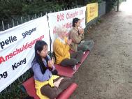 2002年8月7日一整天,汉堡的法轮功学员在汉堡中领馆前炼功、学法、发正念,同世界各地的同修一起呼吁社会各界关注目前香港所发生的一切、并帮助共同制止这出闹剧一般的政治诉讼。我们向走进领馆的人递上真相资料,向过路人、向警察讲述香港事件的真相。过路的车辆也纷纷留意我们的横幅内容,并在红灯处停车时,接过真相资料并表示感谢。傍晚,我们结束了一天的活动,但我们的呼吁没有结束,我们仍会尽我们最大的努力,向德国媒体、政府及善良的人们讲清香港非法诉讼案的真相,帮助共同制止这一无理的政治起诉。