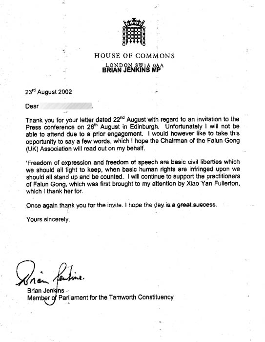 谢谢你于8月22日的来信邀请我参加8月26日在爱丁堡举行的记者招待会。很不巧,由于事先已另有安排,我无法参加。但我愿意利用这个机会说几句话,并请英国法轮功学会负责人代我宣读。