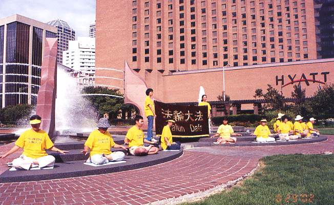 比赛前在公园练功,背后是记者下榻的海特饭店学员们在体育馆入口附近展示横幅和演示五套功法