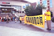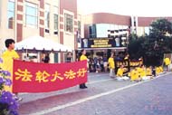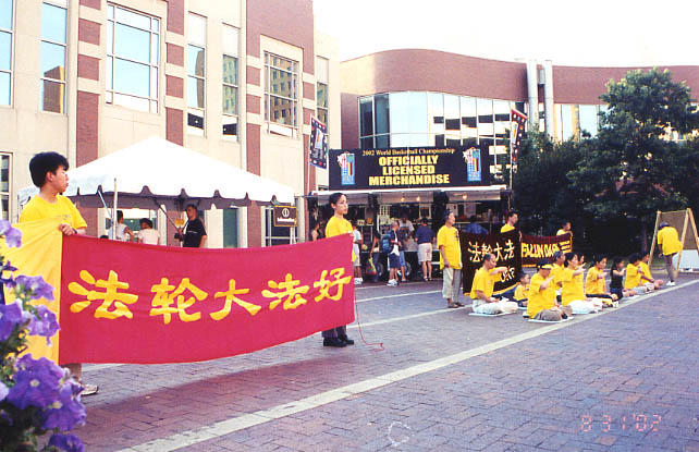 在著名的RGA DOME体育馆外,面对川流不息的人群,身着黄色T恤衫的大法弟子打出了一幅幅醒目的横幅,“向中国同胞问好!”、“法轮大法好”、“法轮大法”等等。部份学员静静地演炼着五套功法,还有的学员向观众们散发着传单和印有“法轮大法好”、“真善忍”字样的扇子。这种扇子制作的非常精美,深受球迷们的喜爱,以至于场内外到处都是拿着“法轮大法好”扇子的球迷。