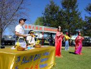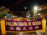 7点多钟游行结束,而当天整条街的夜市才刚刚开始。当大法弟子返回大法信息资料台时,高兴地看到更多的人们主动索取大法真相材料、主动签名,并询问炼功点详情。人们被告知,可从当地报纸上登载的消息,获取更多教功班、炼功点详情。一对夫妇带着2个孩子,告诉大法弟子他们最近正在从黄金海岸往这边搬家,他们全家人打算在附近炼功点参加学炼法轮功。