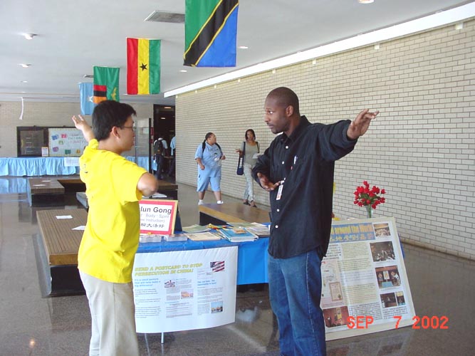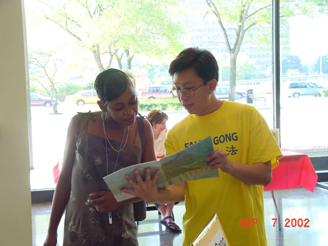 还有一位中年黑人妇女,她说,当她在电视上看到法轮功学员在中国被迫害的有关报道时就伤心地哭了。说着,她的眼里又充满了泪水。