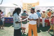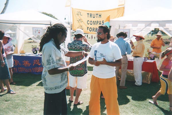这真是一个多元文化节,来自各不同种族的人流不断从我们的展台前穿过,有的人停下来学功法,有的向学员了解法轮功和江氏对法轮功的迫害情况,很多人都拿了大法资料,并在请愿书上签名。这次活动使我们得以向以前没接触到的人群洪法。
