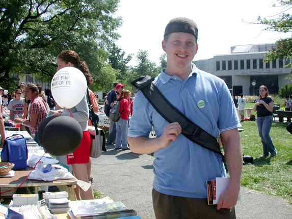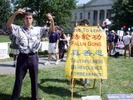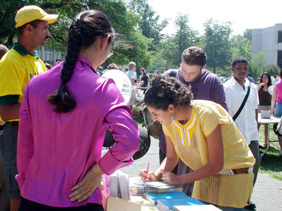 人流如潮的学生们在中英文的“真善忍”前停住了脚步,目光纷纷落在“法轮大法”的横幅上。我能感到,他们终于在纷忙的都市生活中找到了生命中渴望已久的希望,是那么的欣喜,是那么的珍惜!他们被大法弟子们展示的法轮功五套优美舒展的功法所深深吸引,纷纷要求学功。一位教授经过展位,他说他一直在关注法轮功在中国大陆受到迫害这一重大事件,他说:“看,法轮功这么美,迫害他的一定是邪恶的。”学生们把“法轮大法好”的胸牌郑重地戴在身上,表示他们对法轮大法的支持。他们不但珍惜地索要了英文的真相资料与法轮大法简介资料,还主动拿走了一些中文资料,他们说,他们要把法轮大法的美好告诉他们所认识的中国朋友们,把在中国法轮功学员受到迫害的真相告诉中国朋友们。