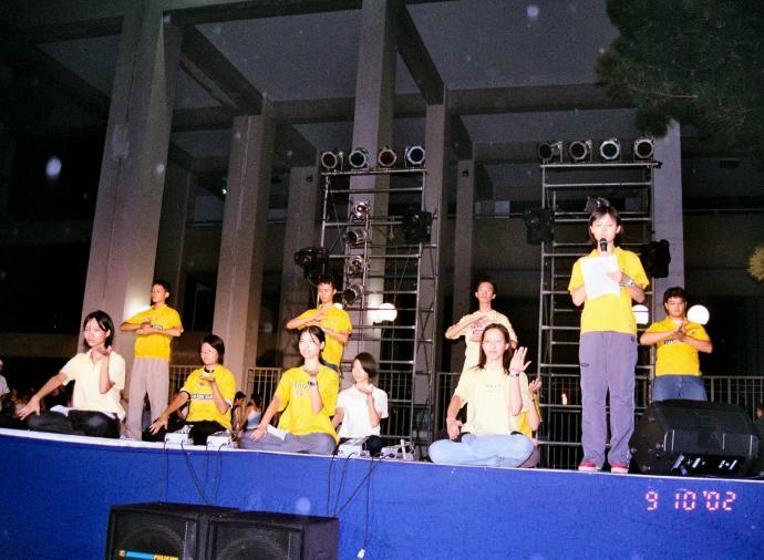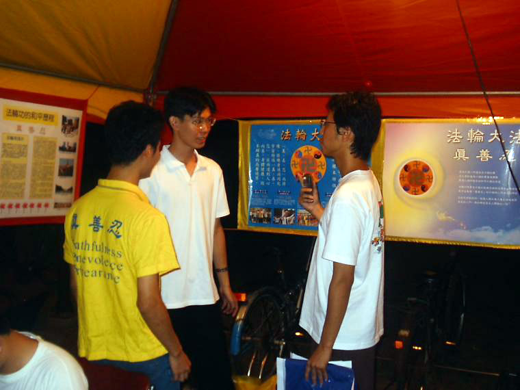 2002年9月10日,是中央大学的新生报到日,学校为了鼓励学生们在课余时间能够参加有益的社团活动,在新生报到日当天的晚上,为新生举办了社团联展,约有一千多位新生参与了当天的活动。中大法轮功社借着这个机会,向学校申请摊位以对同学们介绍法轮功及讲清真相。