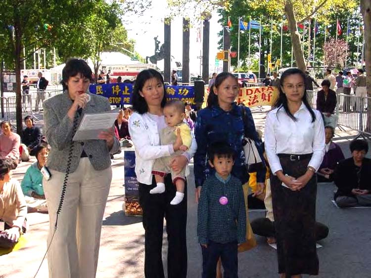 中午12点,来自大纽约地区的法轮功学员与多位受害学员家属举行了营救被迫害的法轮功学员新闻发布会。发布会由来自布鲁克林的娜丁女士主持。法轮大法信息中心的发言人亚当宣读了新闻稿。亚当在发言中指出:这次新闻发布会是全美营救受迫害法轮功学员家属活动的一部份,呼吁联合国及美国社会对此事的关注并希望布什总统在与江十月份会面时严肃提出停止对法轮功的迫害。
