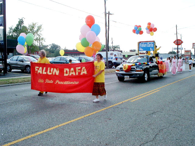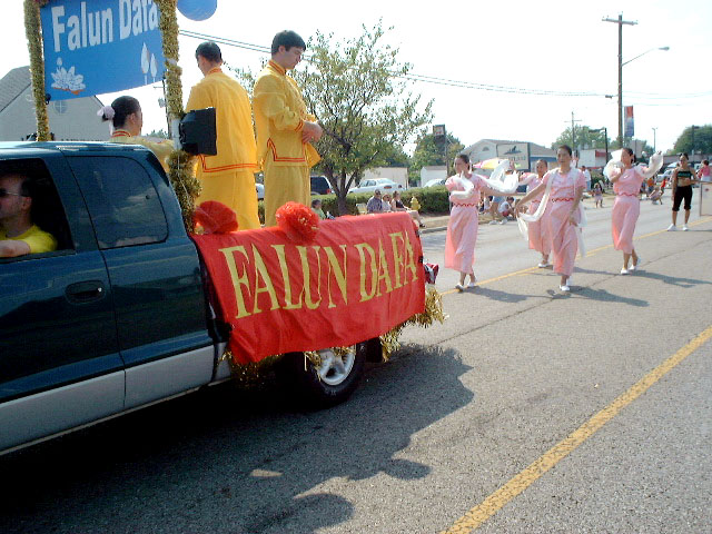 【明慧网2002年9月14日】一年一度的俄亥俄州雷诺兹堡(Reynoldsburgh)市的西红柿节庆典游行于9月8日举行。法轮功学员应邀参加了游行。在时间紧人员少的情况下,学员们同心协力,充分体现了大法学员整体的威力。学员们既展示了大法功法,又表演了观众喜闻乐见的学员自己编排的中国传统舞蹈,连小学员们也担当了发放传单的主力。