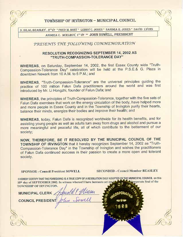 鉴于,艾塞克斯郡(Essex)首届“真善忍日”庆祝活动将于2002年9月14日星期六在纽瓦克(Newark)市中心的P.S.E.& G.举行;并且