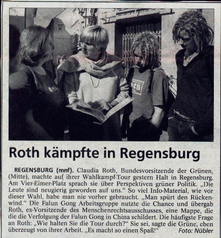 在即将到来的大选前夕,德国各党派在各地组织了许多竞选活动,这为学员向政府讲清真相的工作提供了诸多良机。德国中部巴伐利亚报发表的竞选活动图文报道中提到:借德国绿党主席Roth女士在雷根斯堡(Regensburg)演讲之际,当地法轮功炼功团体向这位前政府人权委员会主席递交材料,介绍法轮功在中国受迫害的情况。