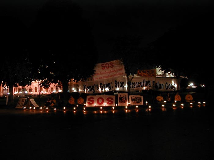 9月20日晚,中国国务院总理朱镕基到奥地利总理府赴宴,奥地利法轮功学员于总理府前举行烛光守夜,悼念在江氏集团对法轮功的迫害中失去生命的修炼者,呼吁停止在中国对法轮功的迫害。