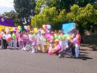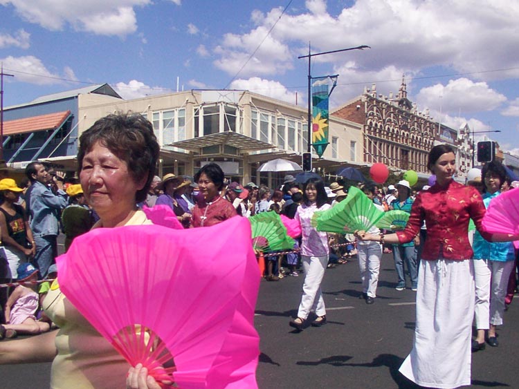 中午12点,游行队伍徐徐步入人群熙攘的市中心,法轮大法的彩车在祥和的“普度”乐曲中缓缓前行,赢得阵阵喝彩。