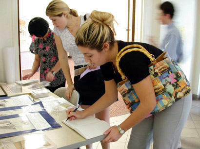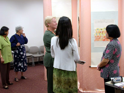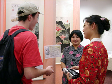 美利坚大学的校长与多个部门的教导主任亲自来到画展厅,与画家亲切交谈,并表示,我们知道法轮功在中国受到镇压一事,我们看到了你因为相信“真善忍”,不放弃修炼法轮功而被关押在中国监狱八个月的事迹后,很敬佩你,我们来到这里是想表达我们对法轮功学员们的敬佩。前来观看画展的学生纷纷在留言簿上留下了他们对“真善忍”带给人们美好的感激和对法轮大法的支持。学生们急切地想要学炼法轮功,并且非常希望能够得到“普度”与“济世”的大法音乐。