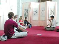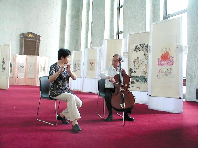 | 几名中学生在展厅学习法轮功功法 | 陈凝芳、陈汝棠夫妇为画展助兴演奏 | 章翠英在办画展的华盛顿DC市政厅前 |