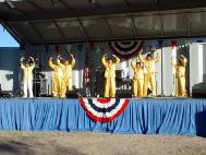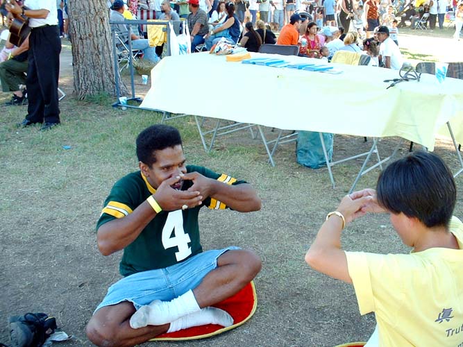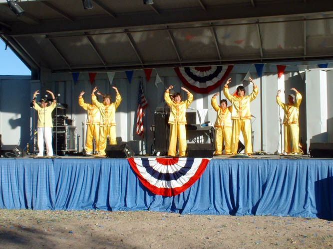 二十三日下午五时,舞台主持宣布:女士们先生们,请以热烈的掌声欢迎古老传统的中国文化──法轮功,七位大法弟子在柔和的音乐声中,优雅自如地演示了功法。