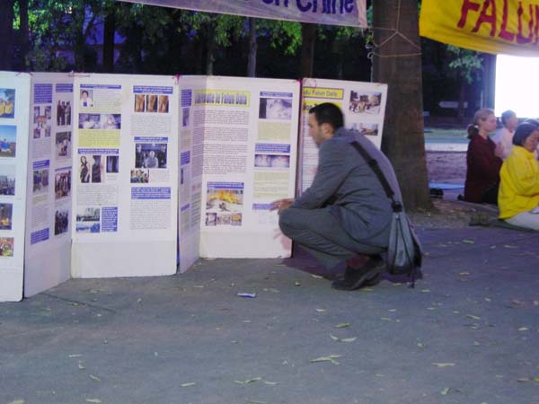 法轮功学员的录像片,引起了行人的关注。他们当中不少人驻足与学员长谈,了解法轮功。