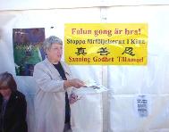 首先两位瑞典的法轮功学员应法轮功之友主席的邀请作了发言。接着又播放了“正法之路”和“是自焚还是构陷?!”的录像片。听众们对法轮功究竟是什么,以及镇压的邪恶有了进一步的认识,有些甚至被感动地流下了眼泪。许多人在讲座结束后,又问了很多问题才离去。