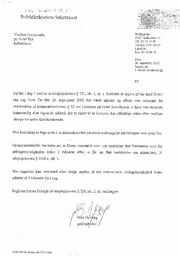 9月24日,瓦西里一家在萨斯莱蒂森旅馆前厅喝茶。当某中国领导人等从他们身边路过时,瓦西里向他们说:“你好!法轮大法好。”由于在场的中国保安的误导,他被丹麦警方拘捕。通过大法弟子和瓦西里一家在警察局向警察们讲清真相,很多警察对发生在中国的邪恶迫害和法轮大法有了基本的了解。他们当时即表示了对大法弟子的支持。