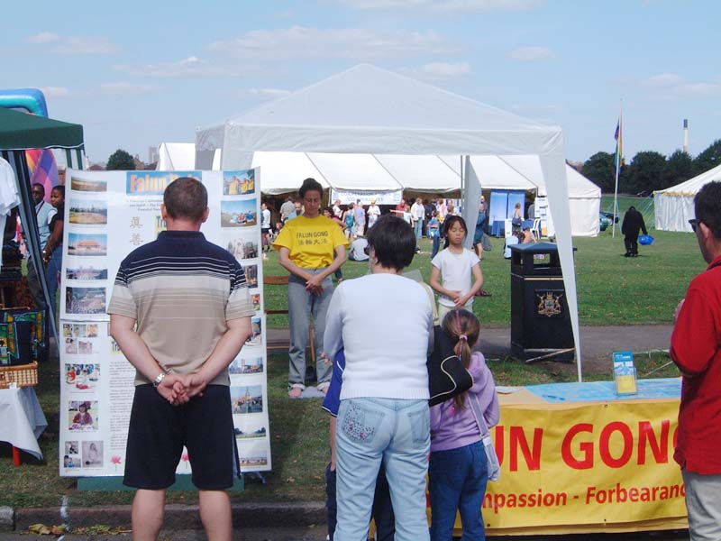 一位在当地政府部门工作,负责处理中国人福利事宜,和诺丁翰的中国人社团有联系的职员来到大法展位,他想知道法轮功到底是什么。他和一位大法弟子交谈了很久,知道了迫害的真相。