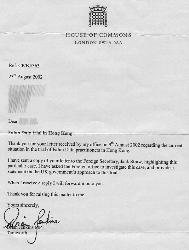 我已经把此信的影印件呈递到外交大臣杰克-斯卓先生那里,强调这一事件的特殊性。我要求外交部调查此事,还要求英国政府表明态度,就审判一事发表声明。