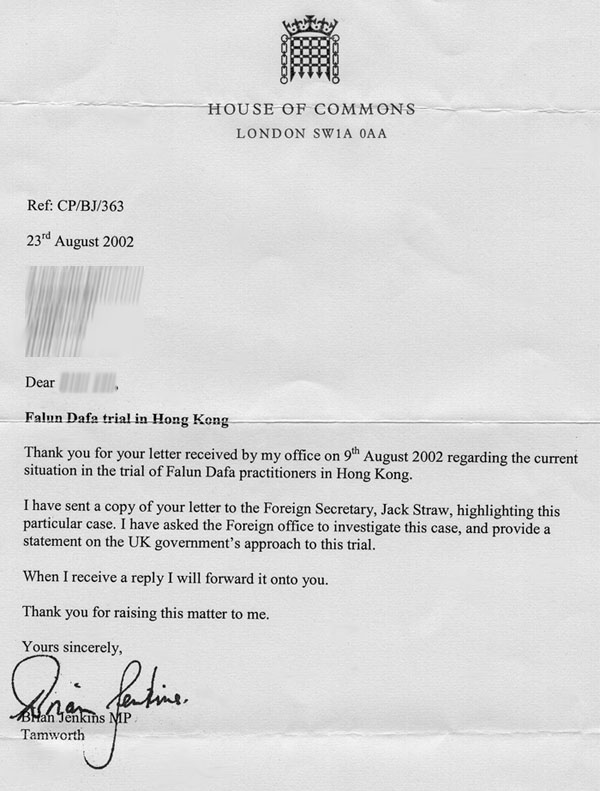 我已经把此信的影印件呈递到外交大臣杰克-斯卓先生那里,强调这一事件的特殊性。我要求外交部调查此事,还要求英国政府表明态度,就审判一事发表声明。