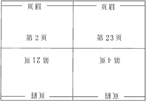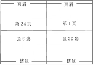 先放一张A4的打印纸,输入页码 24,1,版数为2版,按纸型缩放为16开纸。(即一张纸先打一半)再按“确定”按钮打印此页。将打印完的这页转180度再原样放回打印机(打印机的机型不同,可能旋转方向不同),然后再输入页码22,3,版数为2版,按纸型缩放为16开纸。再按“确定”按钮打印此页(即打纸的下一半)。这样打出来的结果是页脚对着页脚。页眉在纸的两个顶端。注意放纸的时候一定要搞明白顺序,这是一个非常重要的环节。)然后再打另一面,顺序跟上边的一样,输入页码2,23,版数为2版,按纸型缩放为16开纸。最后输入4,21,版数为2版,按纸型缩放为16开纸。这样一张纸的模板就出来,另外的几页依次类推。