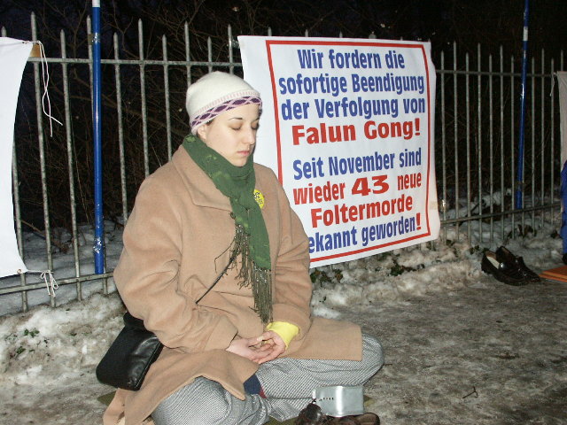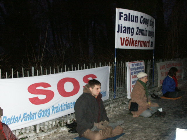 2003年1月12日下午,德国汉堡法轮功学员在使馆发起呼吁活动:要求停止在中国的虐杀。并告知世人:江泽民因群体灭绝罪被起诉。
