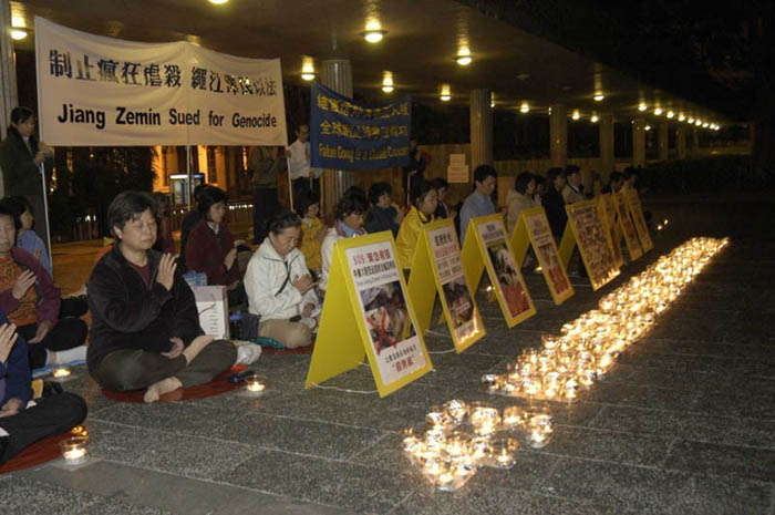 1月13日,香港法轮功学员在中联办外请愿并招待媒体,并于晚间在立法会外的遮打花园进行烛光守夜,在三天的全球呼吁活动中,与各地学员一起揭露江罗集团针对法轮功的群体灭绝罪行,要求中国当局停止虐杀。
