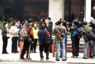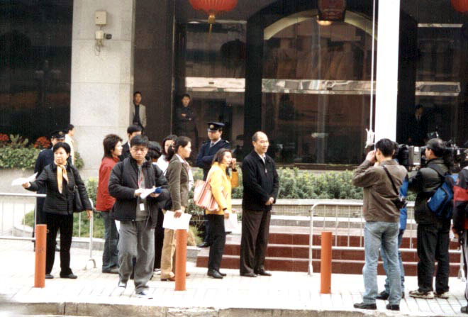 上午9时,大法学员一起到中联办,而中联办范围竟被铁马、大铁链封锁着,连通道口都不留。隔铁链站了许多保安人员与工作人员,10多名媒体记者也被拒山门之外。在场有香港无线电视、亚洲电视、有线电视、电台、东方报等及澳门华侨报、现代澳门日报等记者,还有大批便衣警员。