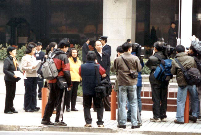 藉此机会,学员就地召开记者招待会。阐述这次请愿活动的原因、目的及意义。因自2002年11月迄今,在中国大陆又有43名大法学员被迫害致死,相信尚有因消息封锁而没报导的案例。现呼吁国际社会关注,要求中国停止虐杀及依法惩治有血债者。学员又当众宣读给中联办的请愿信《要求中国停止对法轮功学员的虐杀》。并向在场记者、警员派发请愿信副本,同时与记者进行简短的交谈、答问。后要求中联办派代表接信,竟无人应答。