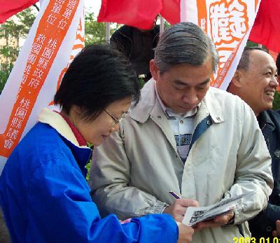 【明慧网2003年1月2日】2003年的元旦升旗活动在桃园县政府前广场举行,学员们自发的参与并当场炼功洪法,主办单位欢迎法轮功学员的参加,会后学员们把握机会向在场的政府官员及民众