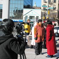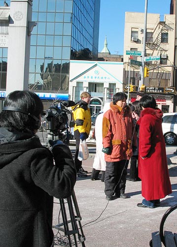 在新闻发布会上法轮功学员接受电视台记者采访