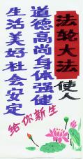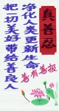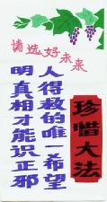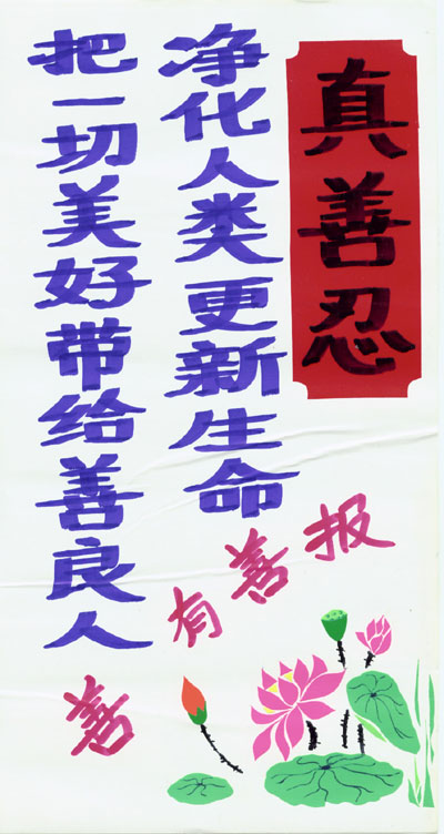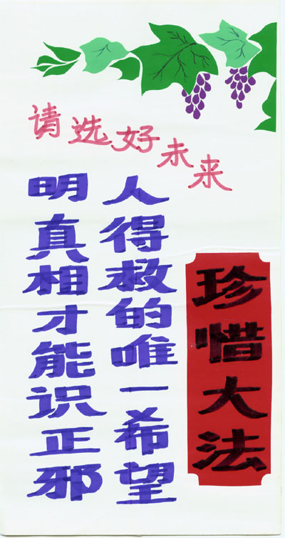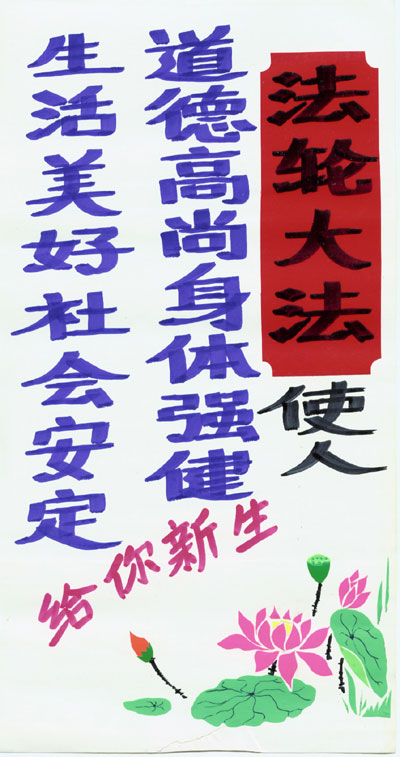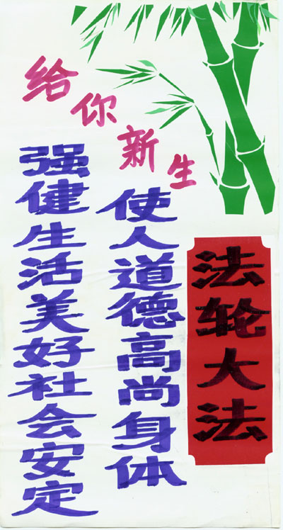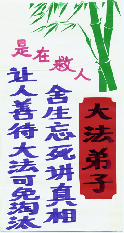 资料,这些资料是在当地环境条件所限的情况下制作出来的。农村的大法弟子在不干胶上书写大法标语,并将莲花、竹子、花草等点缀其上,展现着大法的美好与殊胜,而这些莲花、竹子、花草都是一点点、一条条剪好之后再贴上去的。大法弟子将自己制作的真相资料广泛张贴,受到当地百姓的普遍赞扬。