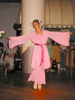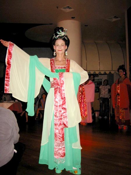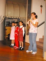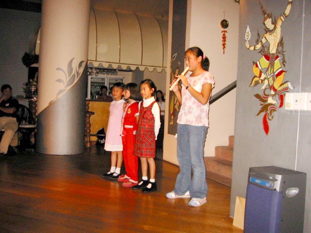 接下来是三名8、9岁的小弟子合唱“法轮大法好”,另一名14岁的小弟子吹箫伴奏。她们活泼纯真的表演赢得了阵阵掌声。随着庄重的乐曲,四名身穿古典唐装的女学员缓步走上场,把欢庆气氛又一次推向高潮。唐装五彩缤纷、雍容华丽,使人们不禁想起一千多年前唐朝盛世的辉煌。最后一个节目是一名12岁的小弟子表演的独舞“鲜花盛开”。节目中所用的乐曲都是大法弟子谱写的。晚宴结束时,学员向所有出席晚宴的宾客赠送了一张录有17首大法弟子音乐作品的光碟。