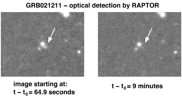 放射加玛射线的天体大爆炸这情况如今改观了──科学家在分秒必争的一次机缘里成功的‘目睹’并留下了珍贵镜头。NASA的HETE卫星在去年(2002)十二月十一日探测到一处六十亿光年以外的一个天体‘伽玛爆炸’。马上在22秒钟之内将消息传给了全世界各处的地面大光学望远镜,镜头立刻对准该方向,记录下了历时大约两小时的‘余光’。(见图)