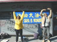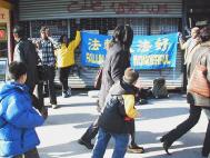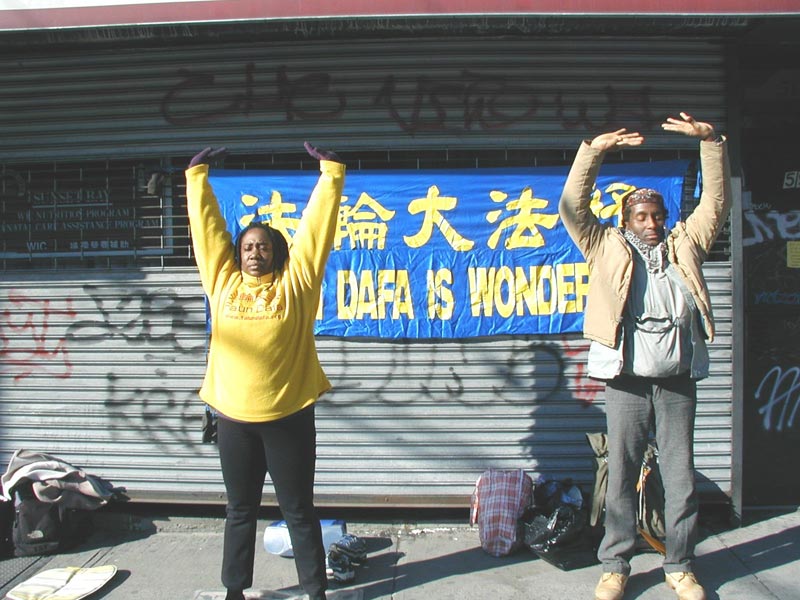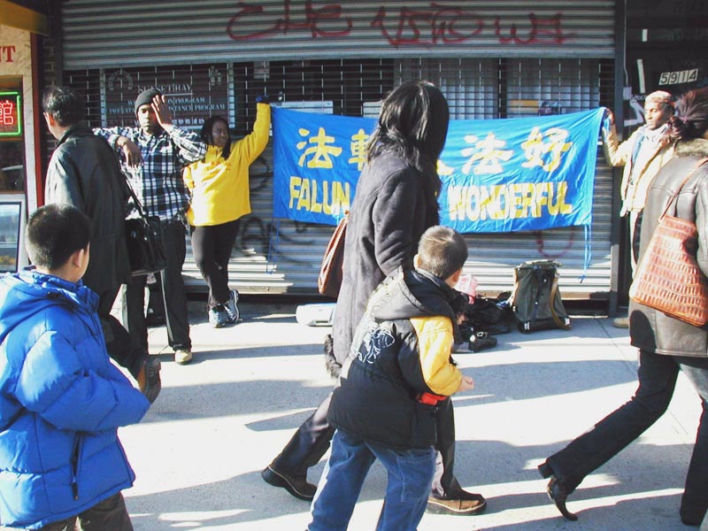 【明慧网2003年1月7日】几位西人法轮功学员自发来到纽约布碌伦的中国街手举中英文大法横幅“法轮大法好”,并表演功法,用亲身的体验向来来往往的中国人讲述大法真相。