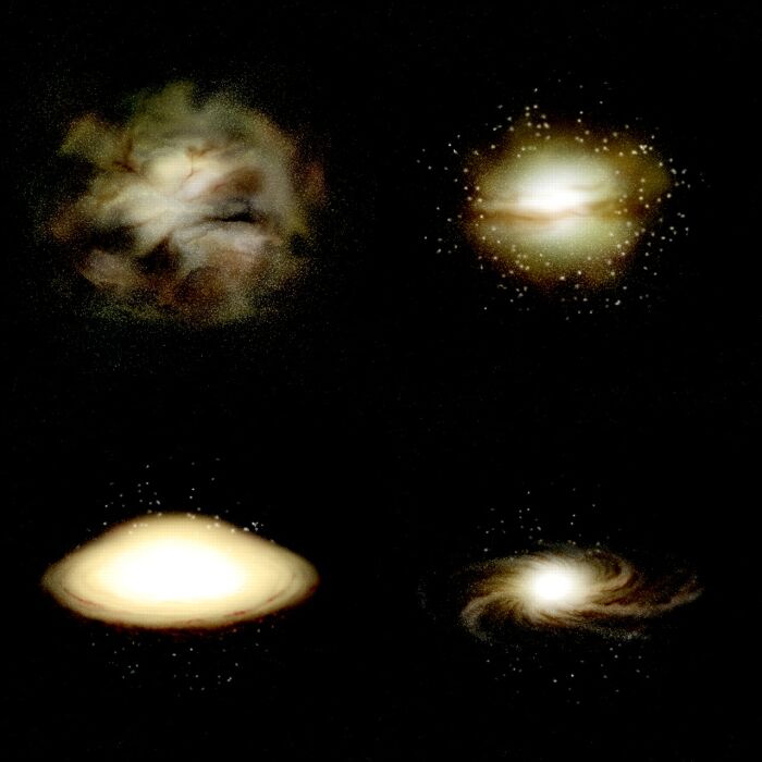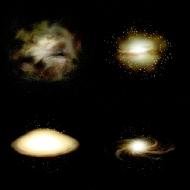 这张图片描绘了银河系存在,演化的四个阶段,代表现代天文学家对星系的认识。那些分布在银河系中的闪亮光点就是球聚体,每一个球聚体包含有几十万颗星星。
